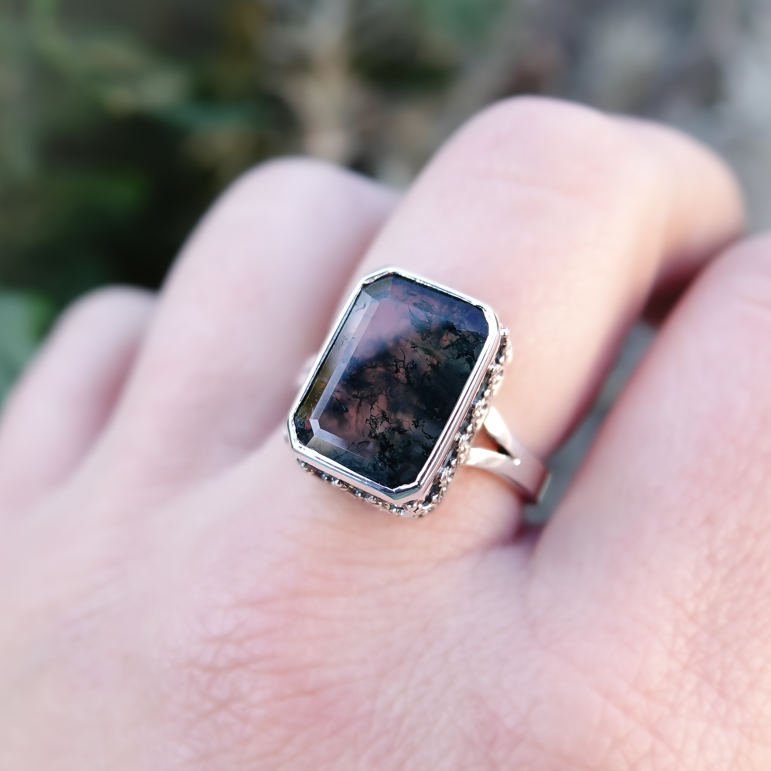 Our Sterling Silver Polaris ring, with an imperfect Moss Agate (14x10mm) stone.