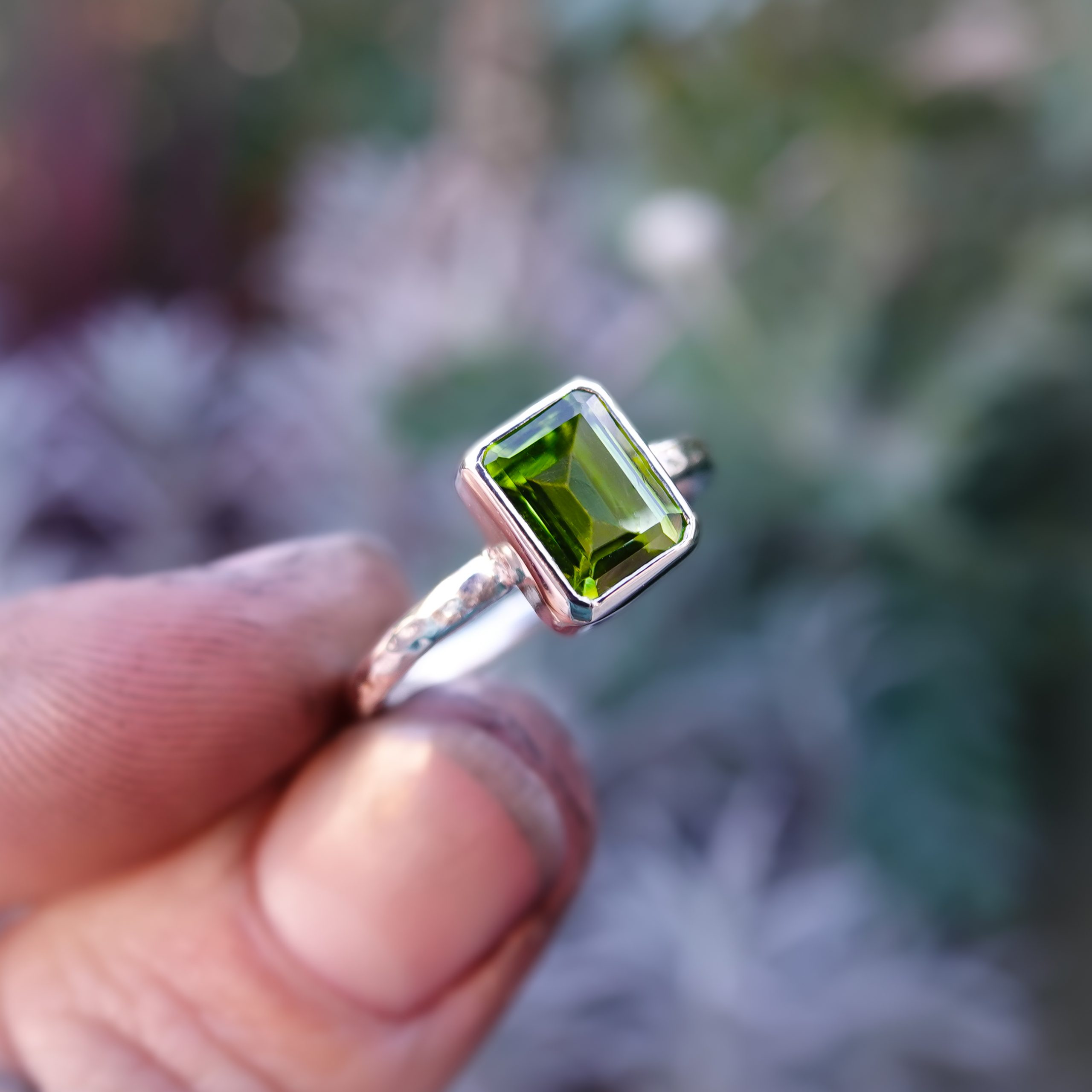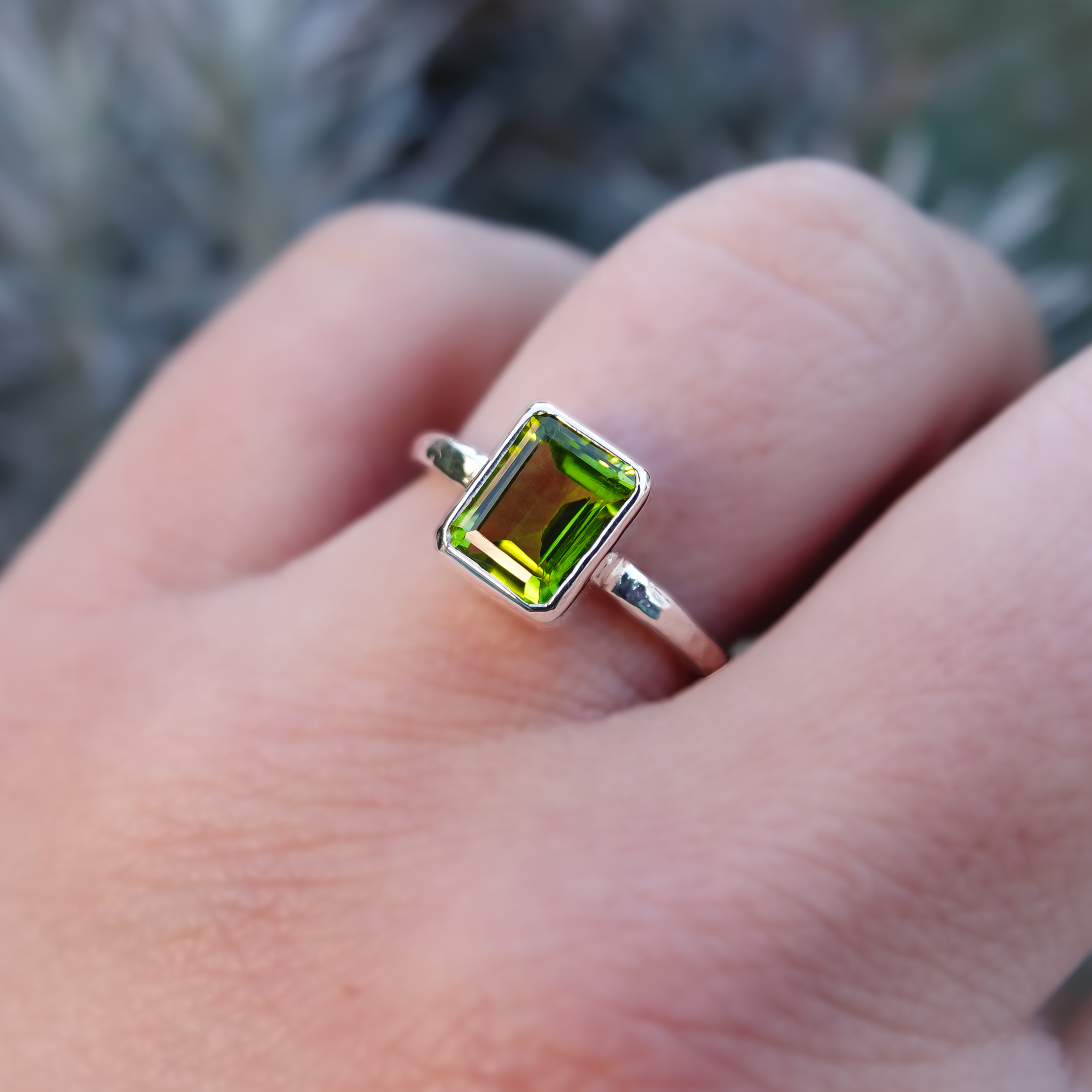 Our Sterling Silver Corentyn ring, with an imperfect Peridot (8x6mm) stone.